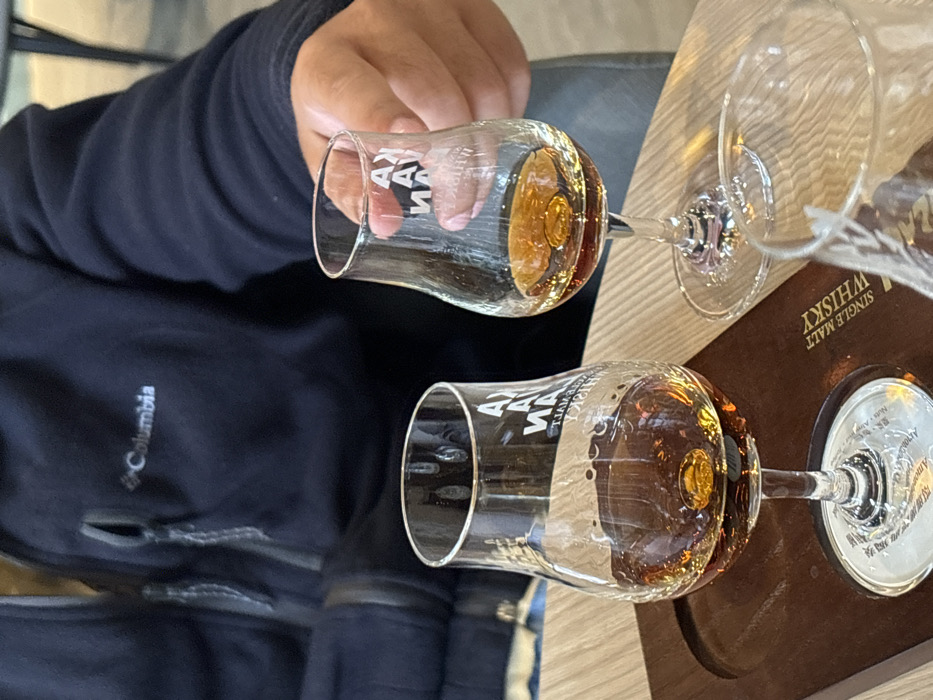 The image depicts a close-up indoor scene at the Kavalan Distillery in Yuanshan Township, Yilan County, Taiwan