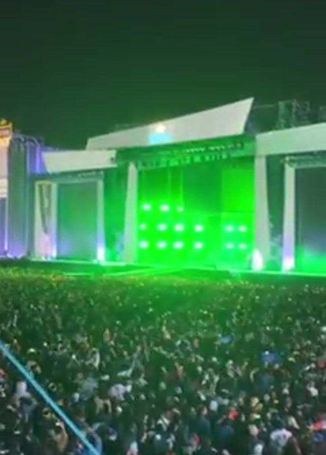 The video depicts a concert at night. A large crowd of people is gathered in front of a stage. The stage is lit up with colorful lights and features large screens on either side. The music playing is loud and the crowd is energetic.