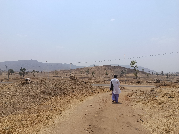 The image displays a dry, expansive landscape in Rafin Pa, Nigeria, under a pale blue, hazy sky. A solitary individual is visible from behind, walking away from the viewer on a reddish-brown dirt path in the foreground. The person wears a white long-sleeved tunic-style top and light blue trousers, carrying a black shoulder bag on their left side. The terrain consists of dry, cracked earth with sparse, brown vegetation and scattered rocks. The dirt path merges with a narrow, dark paved road in the mid-ground. Several dark grey utility poles, each topped with a small light fixture, are positioned alongside the paved road. Faint, dashed lines, indicative of power or communication lines, stretch horizontally across the upper mid-ground. Beyond the road, a barren, rocky hill rises, with distant, larger mountains forming the horizon.