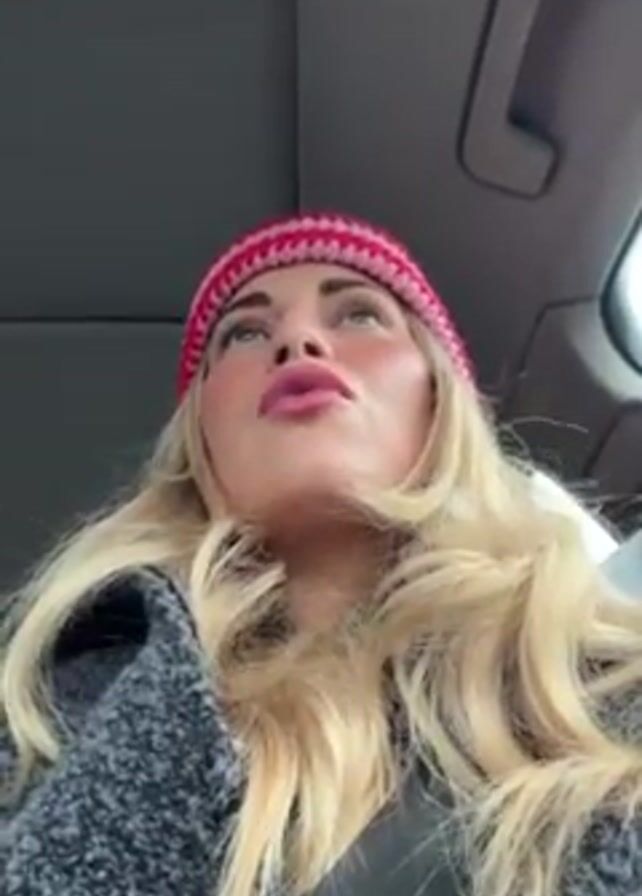 A woman in a car, wearing a gray coat and a pink-and-white crocheted beanie, is seen from a low angle, with her face tilted upwards