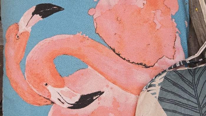 - "The image displays a close-up view of a decorative fabric item, likely a pillow, featuring an artistic rendition of two pink flamingos" by FM-0J88a2, licensed under CC BY 4.0