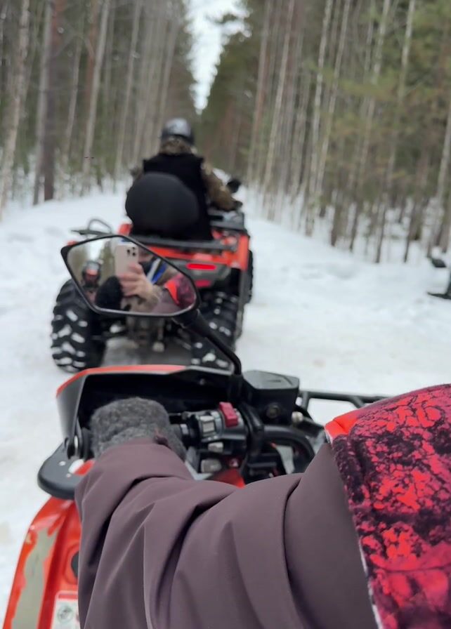 first-person perspective of someone riding an orange ATV on a snow-covered path through a forest. The rider wears a helmet with red designs and a brown jacket. Another ATV, also orange, is ahead on the trail, driven by someone wearing a black helmet and a dark jacket. The side mirror of the first ATV reflects the driver holding a phone, presumably taking a picture or video. The trees on either side of the path are mostly bare. The overall scene is one of a winter ATV ride through a wooded area.
