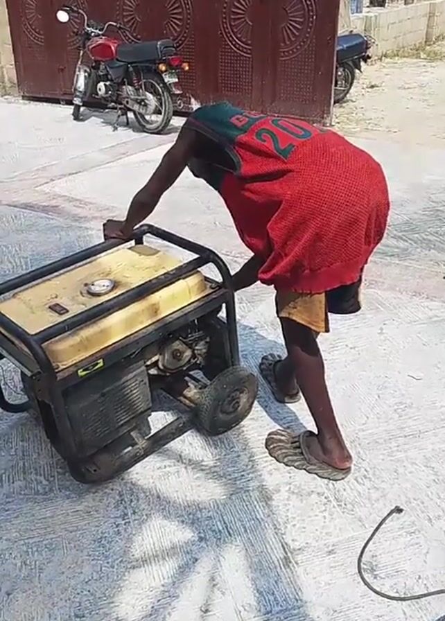 A person is attempting to start a generator. The person is standing in front of a yellow portable generator with a black frame, on a paved surface. They are wearing sandals, shorts, and a red and green jersey. They are using their foot to hold the generator steady while pulling the start cord. In the background, there is a red motorcycle parked in front of a brown gate, and a wire lies on the ground near the generator. The scene appears to be outdoors on a sunny day.