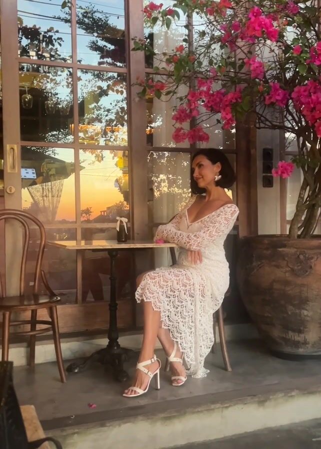 A woman is sitting at a small table in an outdoor cafe. The woman is wearing a white lace dress and white high heels. She has short dark hair and is wearing earrings. She is sitting with her legs crossed and her hands on the table, looking off to the side. Behind her is a large potted bougainvillea with bright pink flowers. To the left of the table is a wooden chair. The background is a large window reflecting an orange sunset sky. The cafe has a rustic, outdoor feel. The woman appears to be posing for a picture.