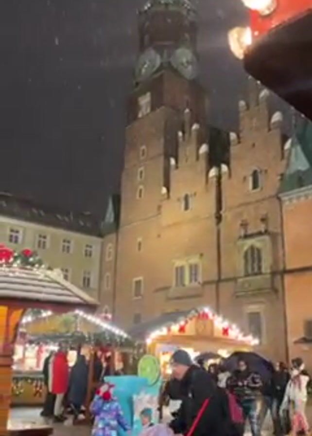 nighttime winter scene, likely at a Christmas market. Snow is falling, illuminated by the warm glow of lights on stalls and the facade of a tall, brick building with a clock tower. People are walking around, some with umbrellas. A man is pushing a stroller with items in it, and a child is nearby. There are decorated market stalls selling various goods. The overall atmosphere is festive and chilly.