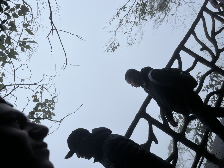 Silhouetted figures stand against a pale sky, surrounded by bare tree branches and foliage. Two figures, one wearing a cap, are in the foreground. A third figure stands atop a structure resembling interlocking branches or a fence. The overall composition is dark and atmospheric, with the focus on the contrasting shapes against the light sky.