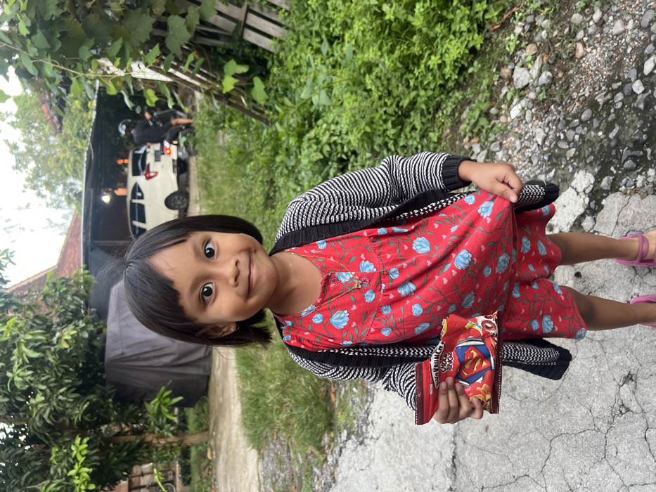 A young girl stands on a grey asphalt surface in Kecamatan Pati, Indonesia, facing the camera with a slight smile