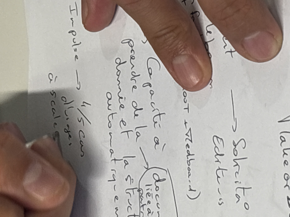 handwritten notes on a white piece of paper. The notes appear to be in a mix of English and another language, possibly French or Spanish. Some of the readable English words include "I lake or", "Solicita", "Edite", "Medboard", "Impulse", "scale", and "4/5". There are circled words like "docum liée à patr", and what appears to be an incomplete phrase with "prendre de la domie et la struct automatiquem". The notes suggest a discussion or brainstorming session involving document editing, data structure, and perhaps a discussion related to "Impulse" and its scale.