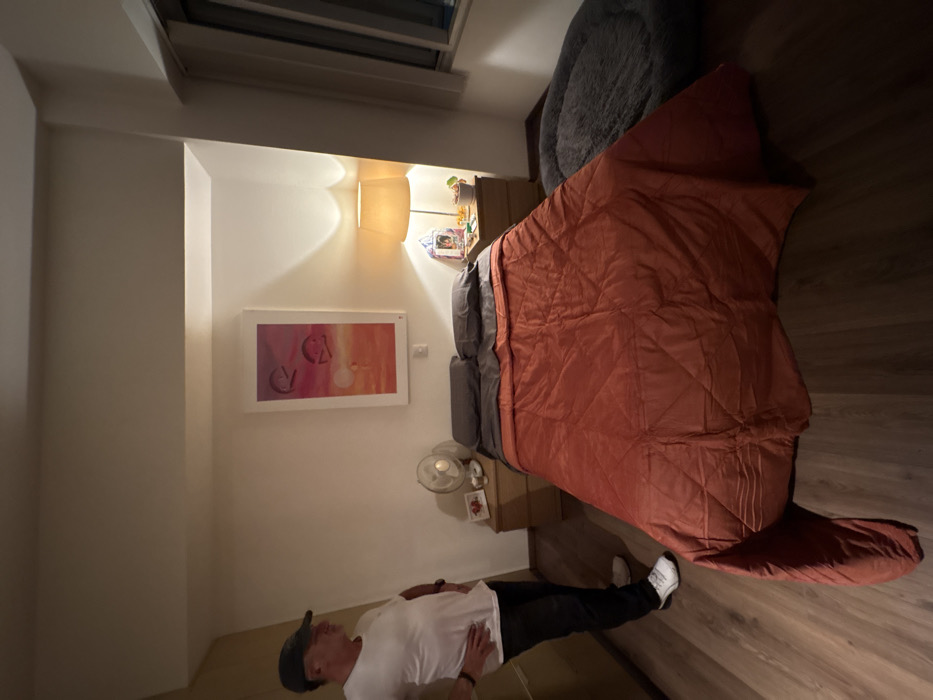 A bedroom features a bed with an orange comforter and a gray dog bed. A man in a white t-shirt, dark pants, white shoes, and a baseball cap is standing near the bed. A lamp illuminates a framed print on the wall. A small fan and decorative items sit on a bedside table. The room has hardwood floors.
