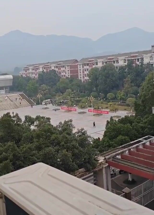 wide shot of a large, paved courtyard from an elevated perspective. Several people are walking across the courtyard. In the background, there are multiple multi-story buildings with light-colored facades and red accents on the roofs. A line of mountains is visible in the distance, partially obscured by a hazy or overcast sky. Trees and other greenery are scattered throughout the courtyard, dividing the space and adding to the naturalistic setting. A large red banner with writing in Chinese characters is placed in the center of the courtyard. The camera is positioned behind a white ledge or barrier, suggesting the perspective is from a balcony or rooftop. The overall environment appears to be a campus or public space within a relatively urban setting.
