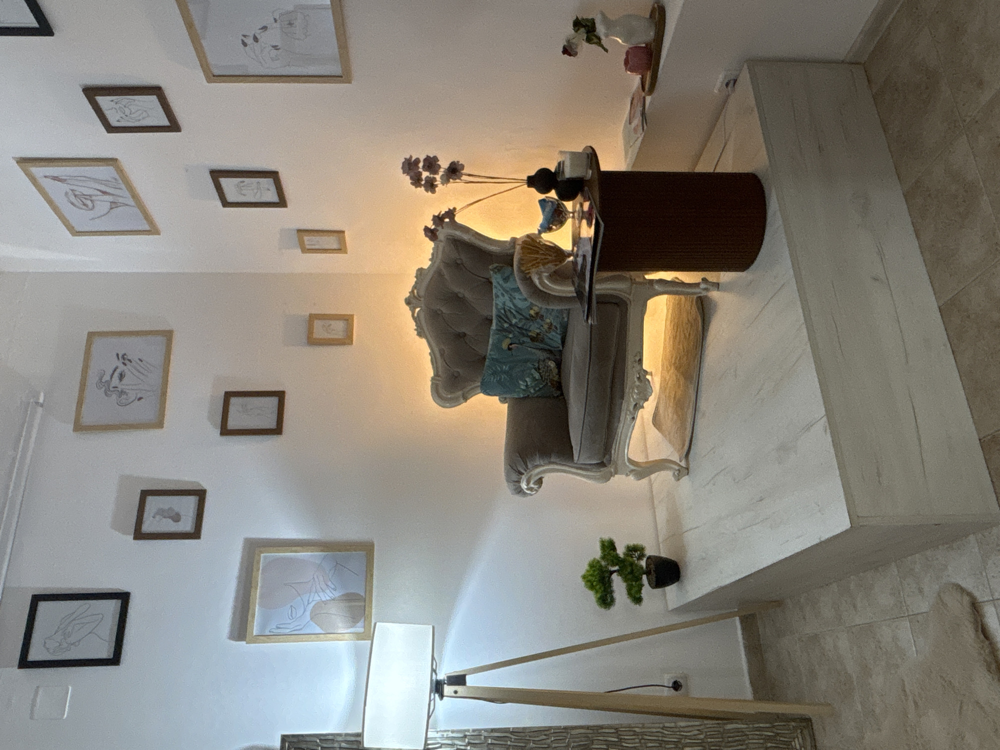 The scene depicts a well-lit interior with a gallery wall featuring framed art pieces. A grey armchair with a patterned cushion is situated next to a side table holding decorative objects, including flowers. A tall white shelf is located near the armchair, and a floor lamp provides additional illumination. A small potted plant is placed near the shelf. The style of the room suggests a modern, possibly Scandinavian-inspired design. There is no evidence to determine it is in Sofia, Bulgaria.