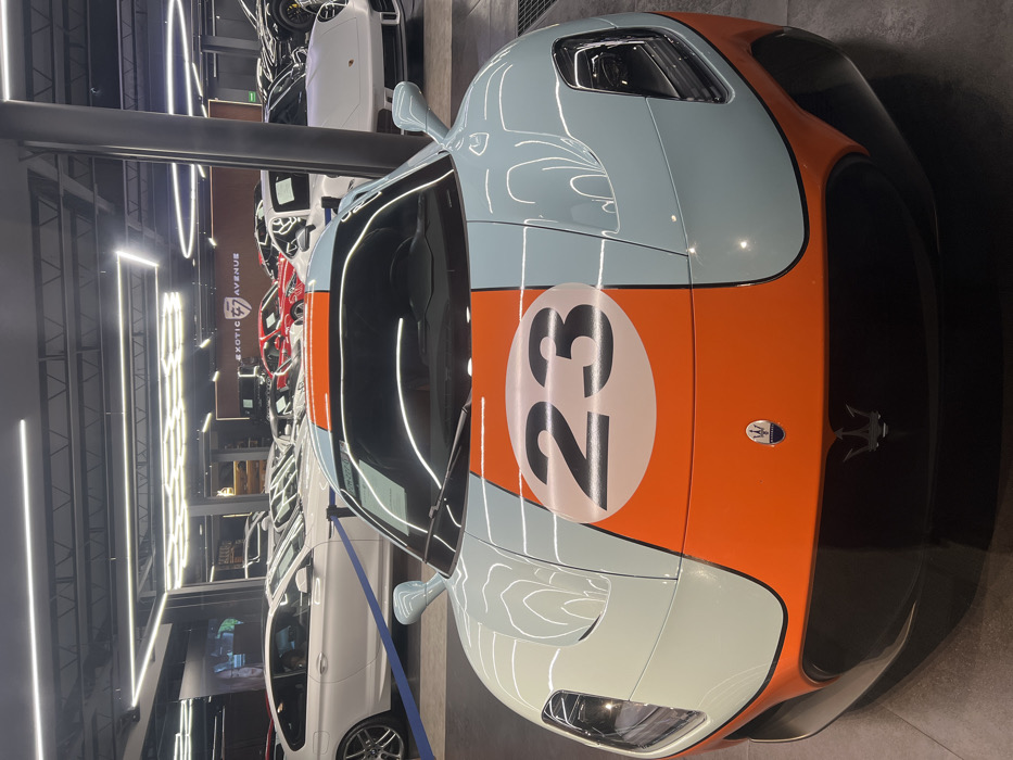 Maserati GranTurismo in the Gulf Oil racing livery with the number 23 prominently displayed. The car is light blue and orange, parked in a showroom with other exotic cars. The interior is not visible. The Maserati logo is visible on the hood. The showroom's lighting is bright, reflecting off the car's surface. The showroom sign "EXOTIC AVENUE" is visible in the background.