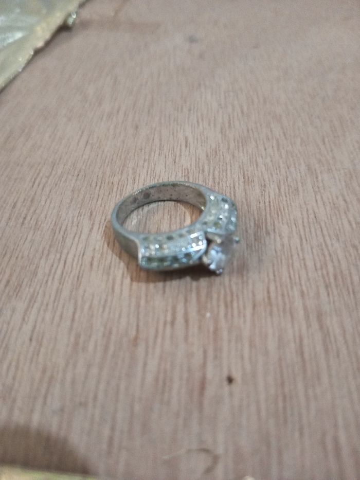 The image displays a silver-colored ring situated on a light brown wooden surface, in the city of Chandragiri, Nepal. The ring features a prominent, clear, faceted central stone secured by four prongs, flanked by sections of the band embellished with multiple smaller, clear, round faceted stones. The metal of the ring appears to be somewhat worn or tarnished. The wooden surface exhibits distinct linear grain patterns and minor surface irregularities. A blurry, light-colored, reflective object is partially visible at the extreme upper-left edge of the frame. No individuals, actions, or interactions are depicted within the scene.