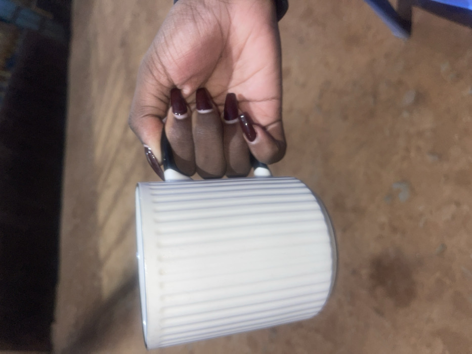 - "The image presents a close-up view of a dark-skinned human hand holding a white, vertically fluted ceramic mug" by FM-TBOla2, licensed under CC BY 4.0
