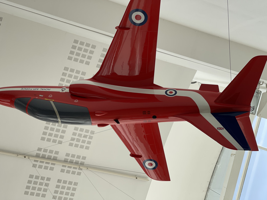 - "A full-scale, highly polished red BAe Hawk T1 jet aircraft, characteristic of the Royal Air Force Red Arrows aerobatic team, is depicted suspended from a white ceiling" by FM-nkgKN2, licensed under CC BY 4.0