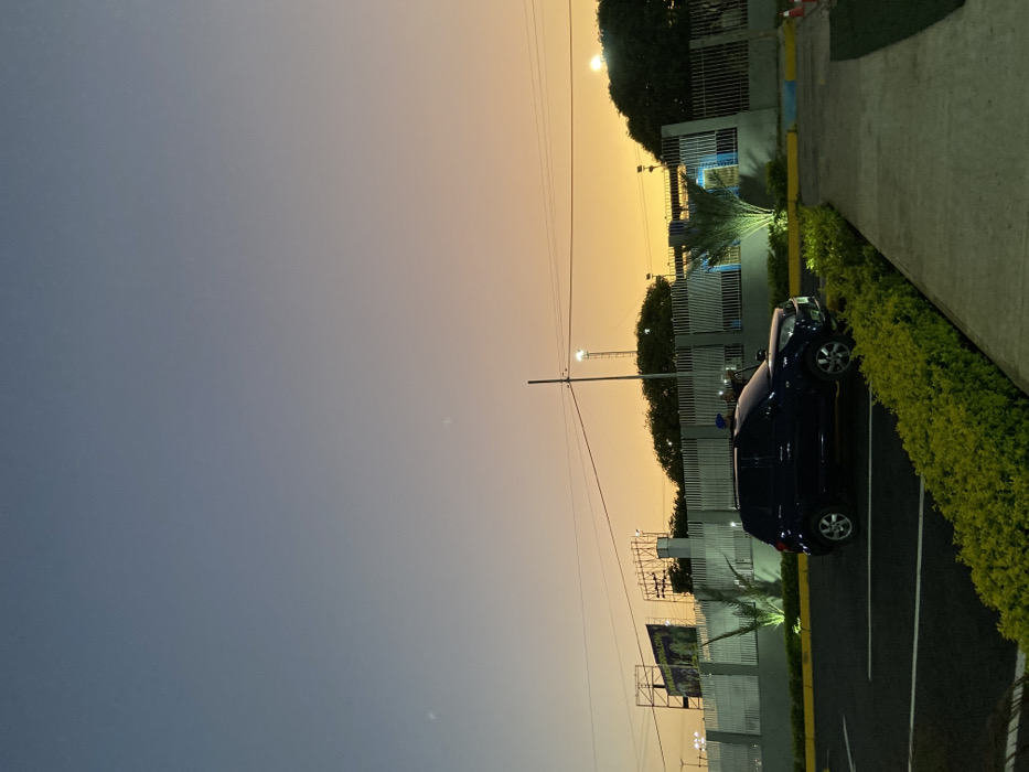 A dark blue SUV is parked in a lined parking space. A strip of green bushes separates the parking lot from a concrete sidewalk. A tall white building with barred windows, advertising billboards, and utility poles is visible in the background under an orange, sunset-tinged sky, contrasted by the darkening blue hue of the sky above.