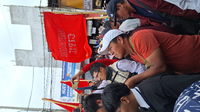An outdoor gathering or demonstration is depicted on an overcast day in Miraflores, Peru
