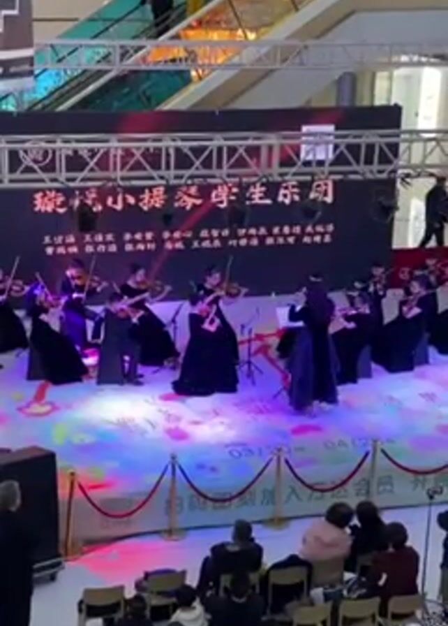 - ". A group of people, mostly women dressed in long, dark dresses, are performing on a stage in what appears to be a shopping mall. They are playing violins and are led by a conductor who is also wearing a long, dark dress. There is a boy in the front row also playing violin. A large screen behind them displays Chinese characters. The stage is lit with colored lights, and there are a number of people watching the performance from below. An escalator is visible in the background." by FM-7sf2h2, licensed under CC BY 4.0