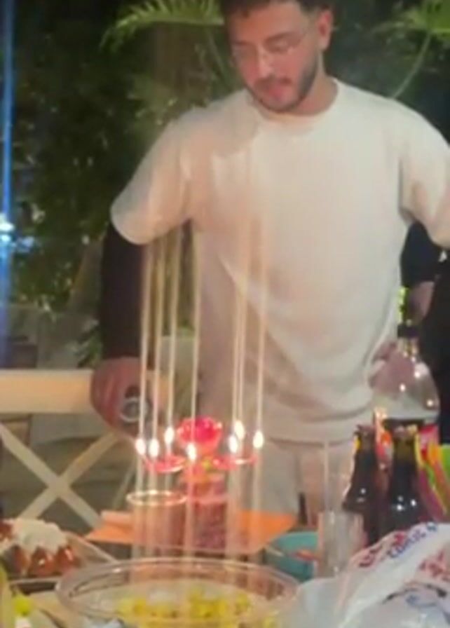 A person with glasses stands behind a table with several dishes and drinks on it. The table is outside and has a white, lattice-style trim. Behind the person, trees and string lights are visible. On the table, there's a cake with lighted candles. The person looks down at the cake, then to the side, smiles, and sticks out their tongue.