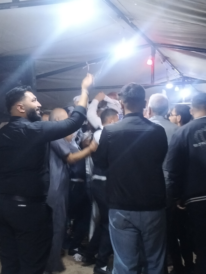 The scene takes place within an enclosed or semi-enclosed structure, possibly a large tent or hall, in Al-Ghanto, Syria