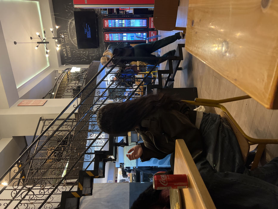 This image depicts the interior of the "Inside You!" restaurant and bar, located at ul. "Tsar Asen" 54, 1463 Sofia Center, Sofia, Bulgaria. The scene shows a multi-level establishment with an industrial aesthetic. In the foreground, a person with long dark hair, seen from behind, is seated at a light wooden table on a yellow metal chair. They are wearing a dark jacket, a white shirt, and dark pants. A red Coca-Cola can and a plate with food are on the table in front of them. Their right hand is slightly raised. Another light wooden table, empty, occupies the right foreground. In the midground, a blonde-haired individual in dark athletic wear (hoodie and sweatpants) is descending a black metal staircase with ornate scrolled railings. The lower steps of the staircase feature yellow and black striped safety markings. The background features a large chalkboard wall with white text, including the prominent phrase "I WANT TO BE INSIDE YOU!" A black flat-screen television is mounted on this wall, displaying what appears to be a system message. To the right of the chalkboard wall, two tall, red-framed commercial display refrigerators are visible, stocked with beverages, and text below them reads "DISCOVER YOUR COOL". A small, light-colored cat is faintly visible near the base of the rightmost refrigerator. Overhead, a modern chandelier-style light fixture with multiple exposed bulbs illuminates the space. The flooring is light-colored wood or laminate.
