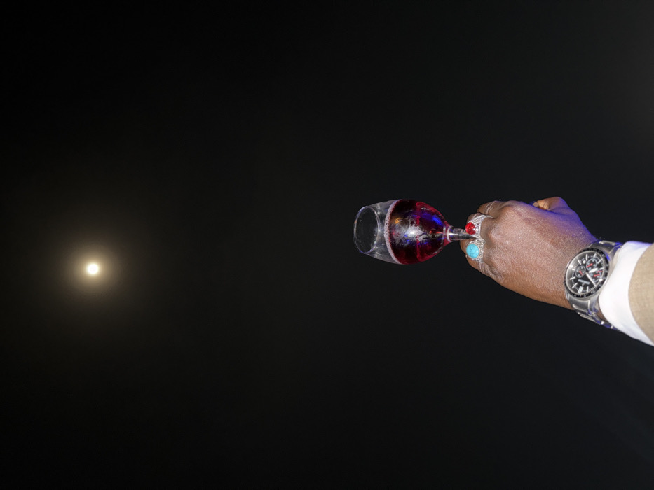 A wine glass filled with red liquid is held by a dark-skinned hand adorned with rings and a wristwatch. The background is predominantly black with a small, bright light source in the distance, resembling a moon or a distant star. The hand holding the glass is positioned to the right, while the light source is on the left, creating a contrast between the two elements.