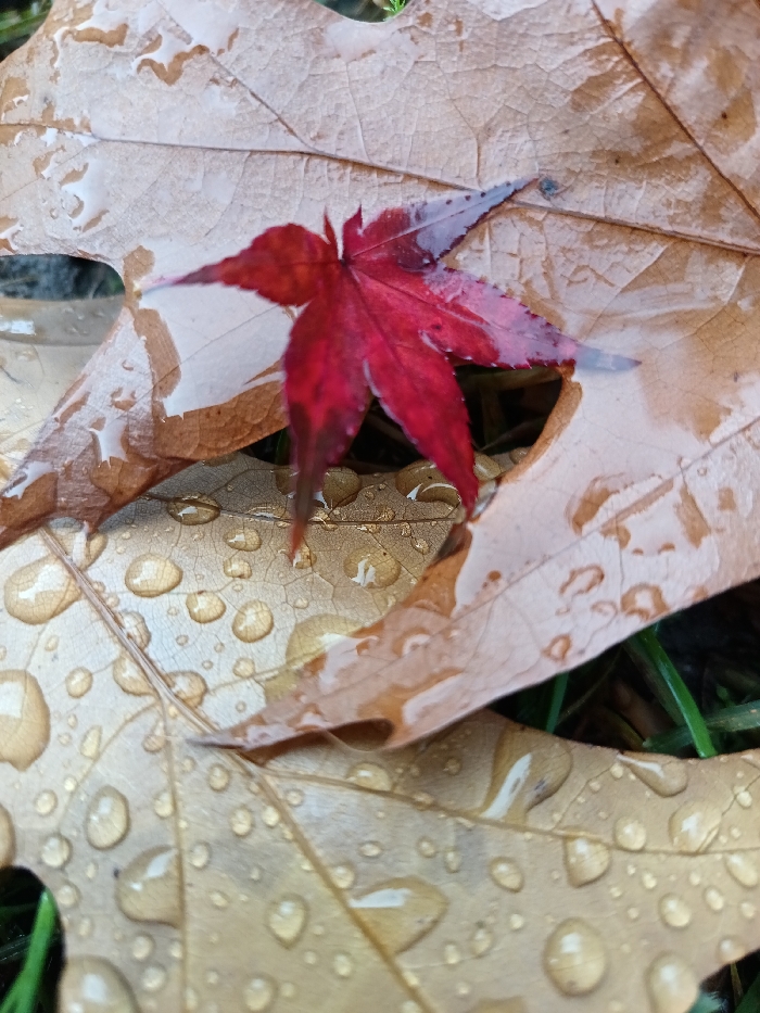 The image displays a detailed close-up of three fallen leaves on the ground in Leipzig, Germany. A small, five-lobed dark red leaf, approximately 5-7 cm in length, consistent with a Japanese Maple, is positioned in the upper center. This red leaf exhibits darker edges and appears damp. It rests partially on two larger, overlapping, lighter brown leaves, likely from an oak or similar deciduous tree, each measuring roughly 15-20 cm. Both brown leaves are extensively covered with numerous clear, spherical water droplets, ranging from 1mm to 5mm in diameter, which adhere to their surfaces, accentuating their venation patterns. Hints of green vegetation, consistent with grass, are visible at the extreme edges of the background and foreground. The presence of water droplets indicates recent precipitation or dew. The scene is illuminated by soft, diffused light.