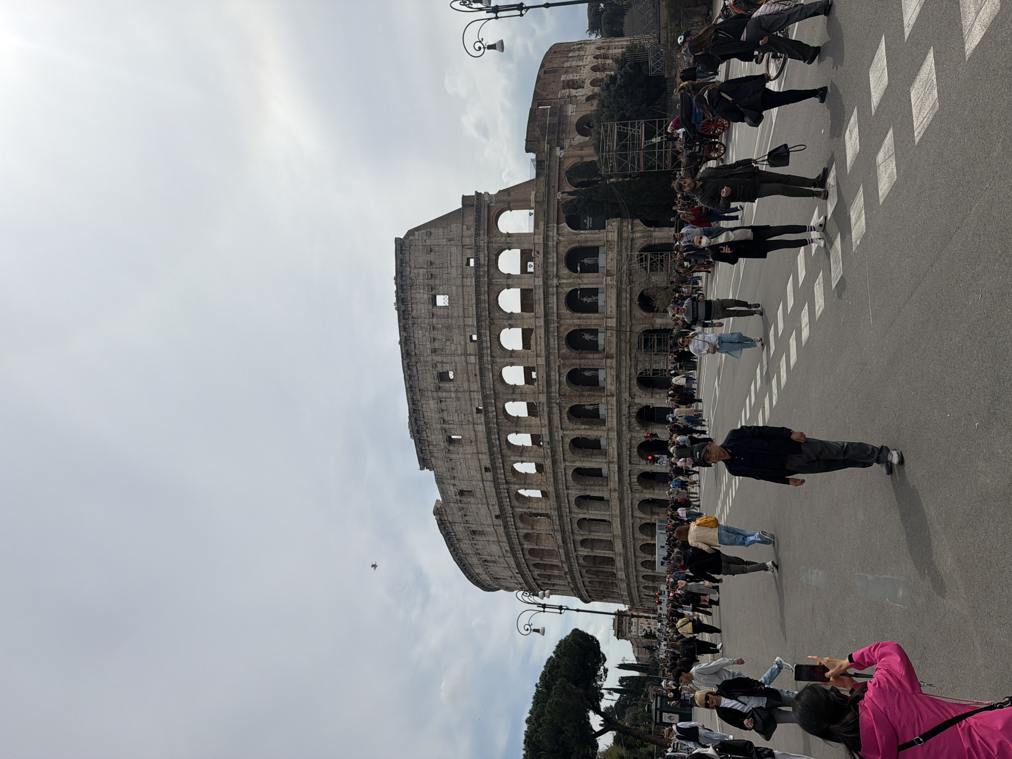 Colosseum in Rome, Italy, with numerous tourists. A street with a crosswalk is in the foreground. People are walking and taking pictures. The sky is overcast. Streetlights are visible.