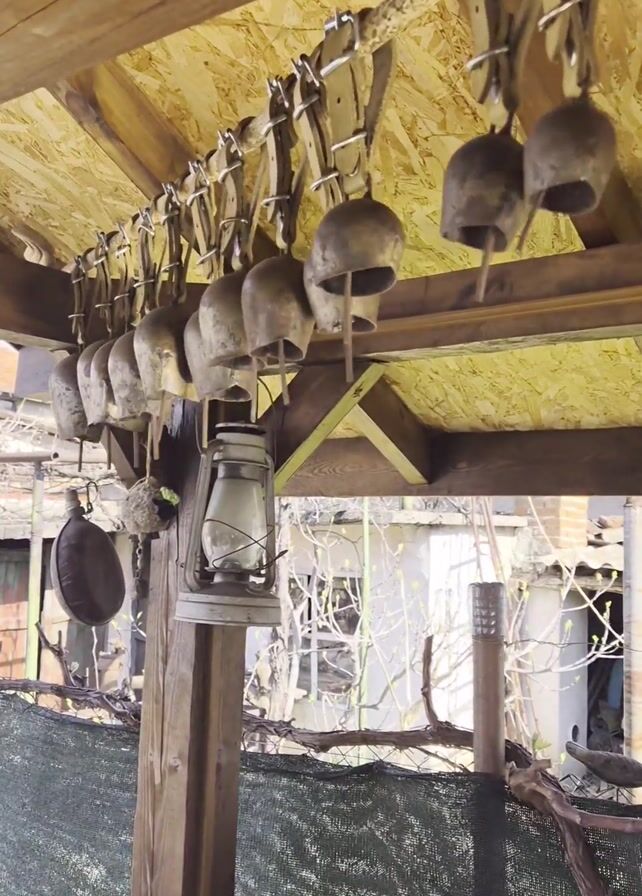 set of rustic cowbells hanging from the ceiling of a wooden structure. The bells are of varying sizes and are attached to leather straps. They jingle from being touched in the background. Below the bells is a lantern and some decorative items. The structure is open on one side, and a mesh fence is visible in the foreground. Beyond the fence, a dilapidated building can be seen.