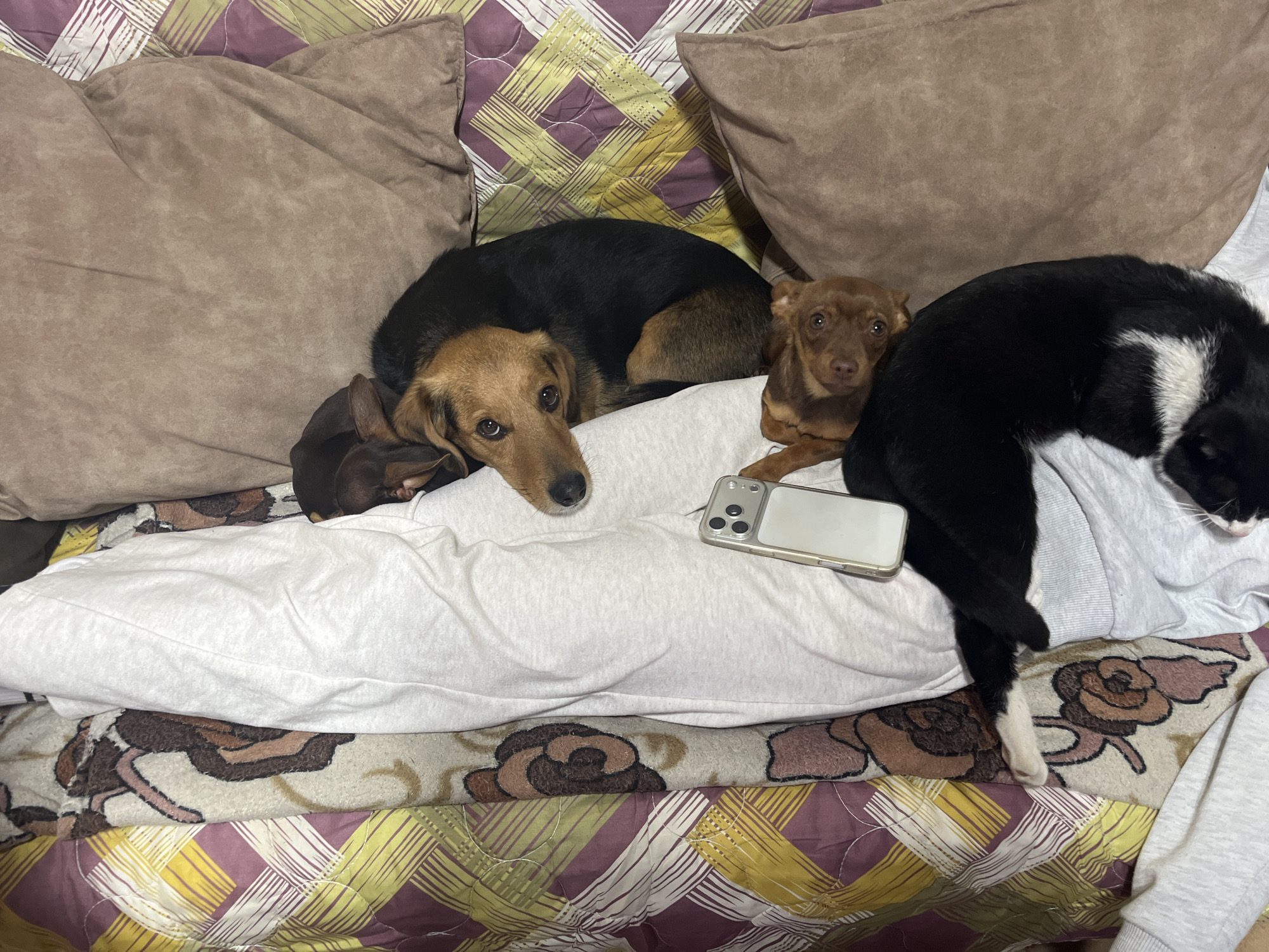 - "view of a couch or bed setting, with three dogs and a black and white cat resting on a white pillow" by FM-AzwCH2, licensed under CC BY 4.0