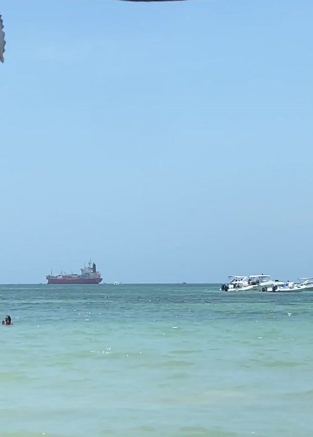The view from under a sunshade shows a beach scene with a calm, aquamarine sea under a clear blue sky. A white and red fishing boat, labeled "El Arca de Noe" in black lettering, sits in the foreground, partially obscured by the sunshade. In the background, several people are swimming in the water. Further out to sea, two boats are visible, one a small speedboat, and the other a large cargo ship. The overall scene is peaceful and scenic.