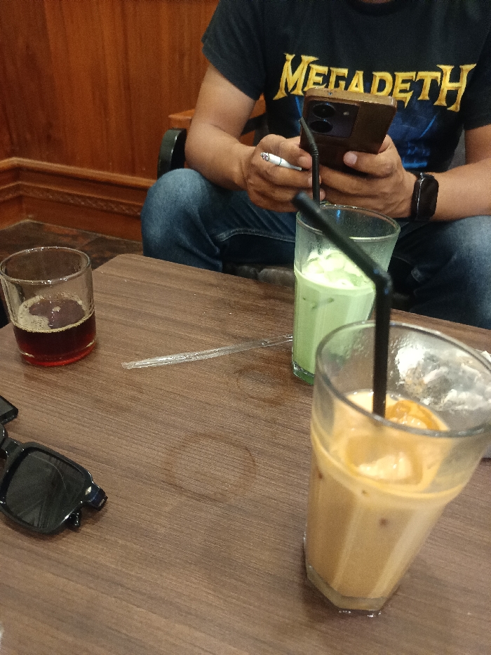 A person wearing a Megadeth t-shirt and jeans sits with a phone and a cigarette in hand. On the table are three drinks: a small glass of dark liquid, a glass of green liquid with ice and a black straw, and a glass of light brown liquid with ice and a black straw. Also on the table are a pair of black sunglasses and a clear plastic stirrer. The table has a brown wood-grain surface.