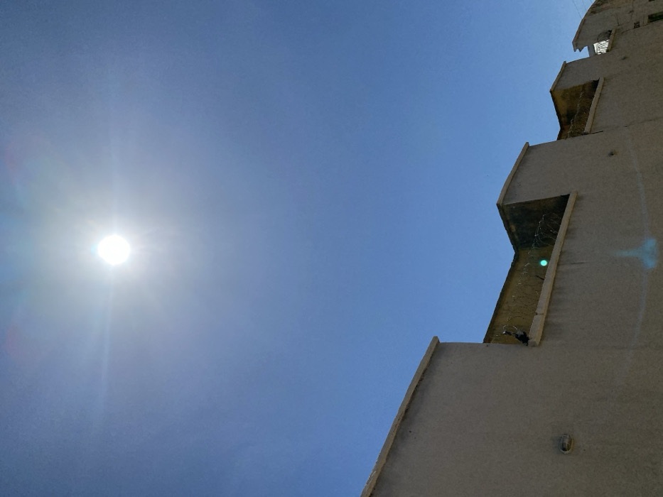 The image displays an exterior view of a property wall in Dabawa, Nigeria, under a clear, bright blue sky. The sun, a radiant white disc with visible lens flares, is positioned in the upper center of the frame. A light-colored, possibly concrete or stucco, perimeter wall occupies the lower third of the image. This wall features a stepped or castellated top edge. Barbed wire or razor wire is affixed along the upper sections of the wall, indicating security measures. Discoloration, appearing as yellowing or greenish staining, is visible on the top interior ledges of the wall. A circular fixture is mounted on the lower-left section of the wall. A small, bright green circular light anomaly (lens flare) is present near the top of the wall, slightly left of center, with a larger, fainter blue elongated light anomaly (lens flare) visible in the lower center, below the wall. No individuals or specific activities are depicted.