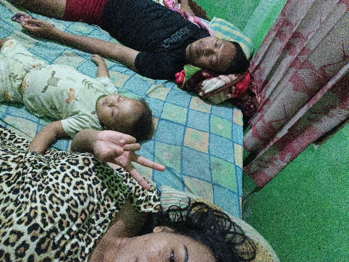 The image captures three individuals resting on a bed within an indoor residential setting in Kecamatan Pati, Indonesia