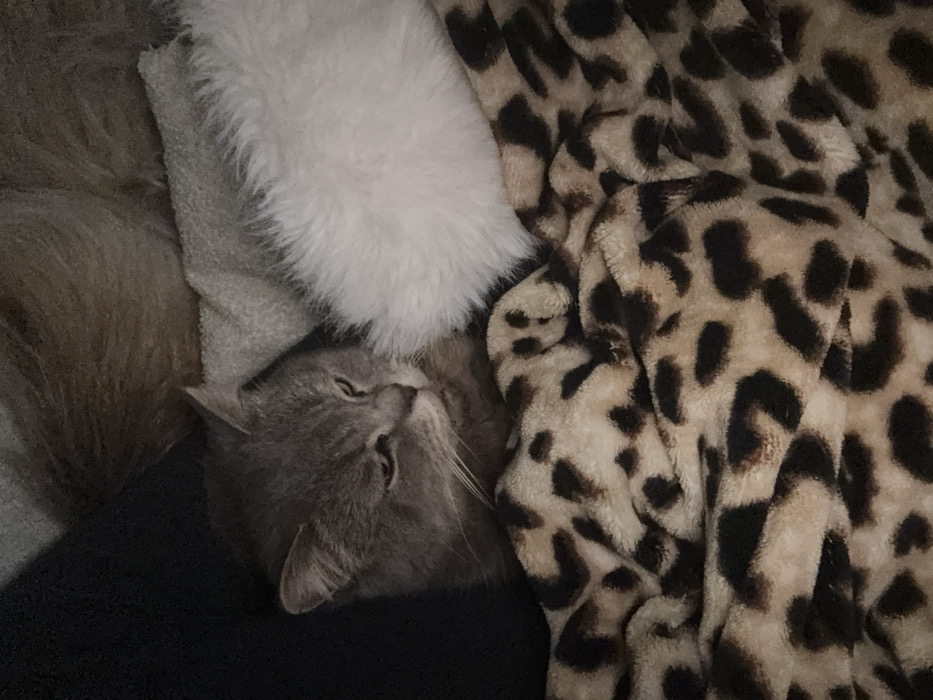 This image depicts a domestic cat resting in an indoor environment in Tielrode, Belgium. The subject is a short-haired grey cat with yellow-green eyes, positioned with its head and upper body visible. Its eyes are partially closed, suggesting a state of relaxation or sleepiness. The cat's face is oriented slightly downwards and to the right of the frame. To the immediate right of the cat's head, a dense, white, fluffy object or fabric is present. The lower portion of the frame, including the area beneath the cat's chin and chest, is covered by a plush blanket featuring a brown and black leopard print pattern. A dark, possibly black, fabric is visible on the left side, adjacent to the cat's head, and a lighter brown, textured surface is present in the upper background. The lighting is subdued, contributing to a tranquil atmosphere. No other individuals or active interactions are visible in the scene.