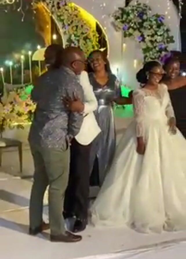 A wedding celebration is taking place. A bride in a long white gown, stands beside the groom in a white tuxedo jacket. The party stands on a white platform decorated with string lights, greenery, and artificial flowers, with a half-moon shaped backdrop. Several guests stand alongside the couple, interacting with them. A man in a gray shirt embraces the groom. A woman in a silver dress smiles toward the couple. A man in a black suit stands toward the left. Additional guests can be seen near the edge of the platform.