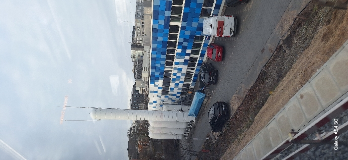 The image depicts an industrial scene at the Kampffmeyer Mühlen facility, part of GoodMills Deutschland GmbH, located at Reiherstieg 21107 Hamburg, Germany. The perspective is elevated, possibly from a train window, looking down onto the complex under an overcast sky, with reflections visible in the upper portion of the image. In the foreground, a concrete walkway with square paving slabs is visible, bordered on the left by a red and white striped metal railing. Below the walkway is a narrow strip of gravel. An earthen bank separates the foreground from a paved street or parking area. The central elements are a large, multi-story industrial building and a cluster of silos. The building features a distinctive facade composed of a checkerboard pattern of dark blue and white square panels, with numerous dark windows. To the left of this building stand several white, cylindrical industrial silos. The most prominent is a very tall, slender silo with vertical external piping or a ladder system and horizontal markings along its side. Behind it are several shorter, wider silos. Reflected faintly in the sky above the tall silo, the text "MINDESTENS HALTBAR BIS" is discernible, indicating a food-related facility. At the base of the silos and adjacent to the building, a large blue tarp or covering is present. Four vehicles are parked on the paved surface: a black SUV/hatchback, a dark grey SUV, a red compact car, and a white delivery van with red lettering, likely corporate branding, visible on its rear. In the background, other dark-toned industrial or commercial buildings with flat roofs are visible, interspersed with bare-branched trees. No individuals are clearly visible or engaged in specific actions. The environment is an urban industrial zone, characterized by functional structures and infrastructure.