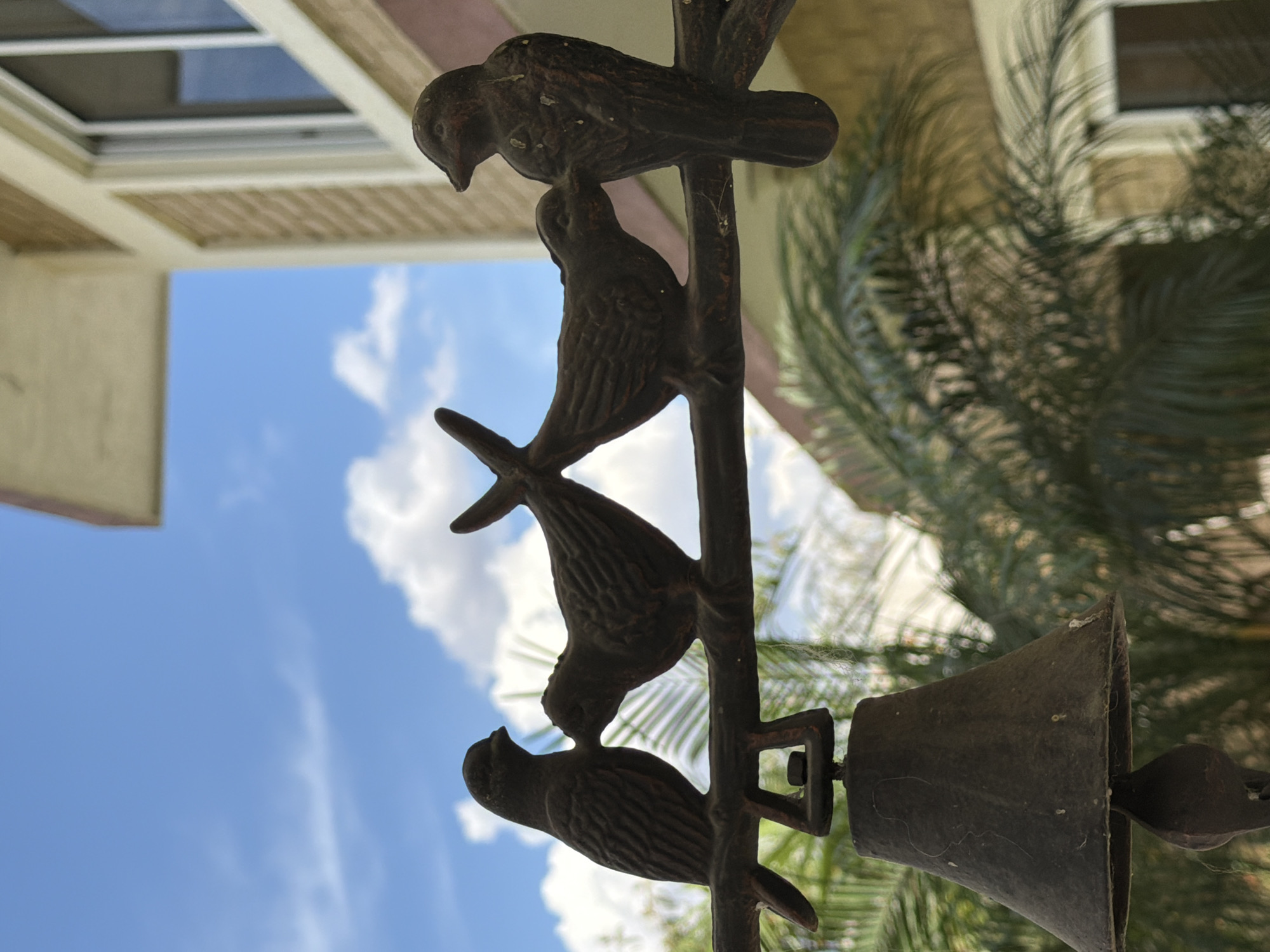 A vertical shot shows a weathered bird-themed wind chime against a backdrop of a clear blue sky with scattered clouds and a partially visible building with windows