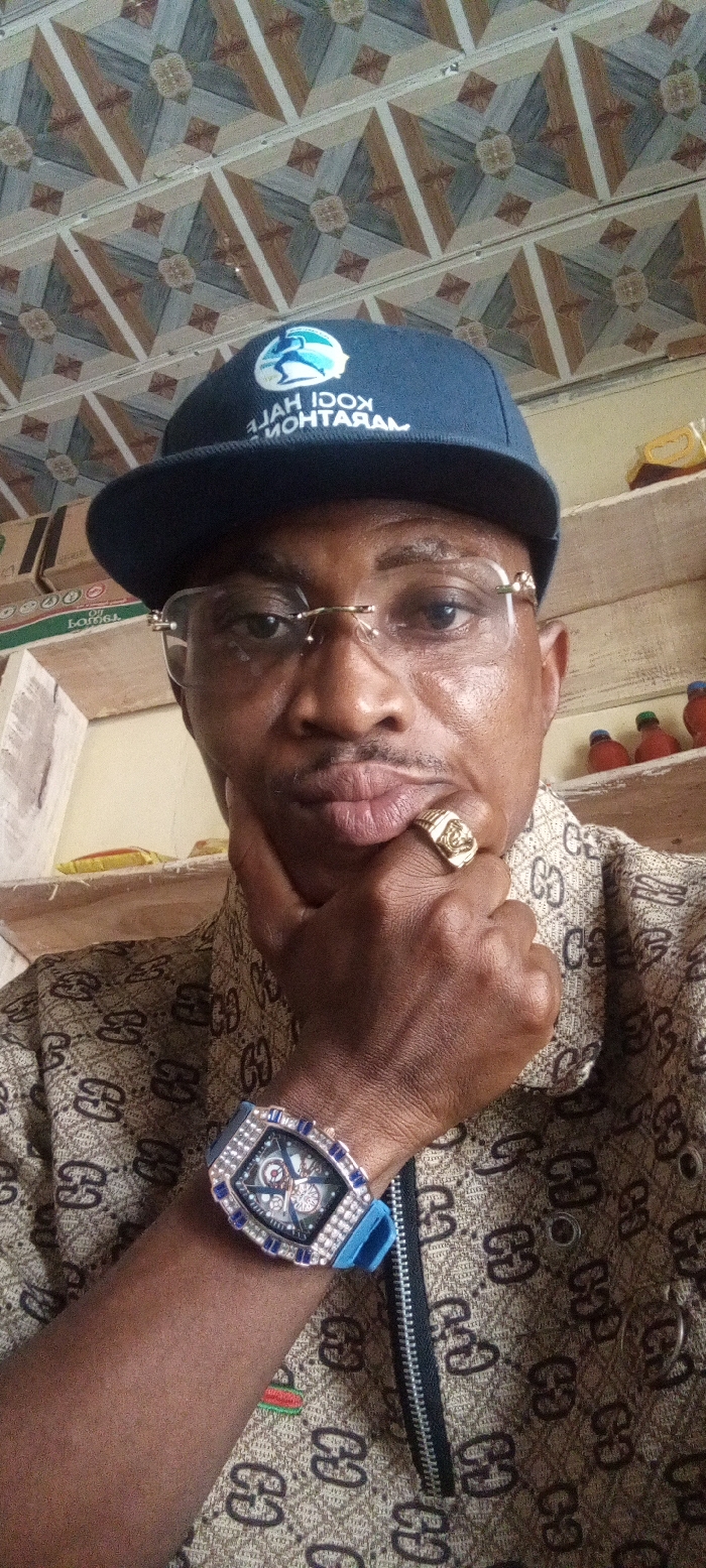 A male individual is depicted in a close-up, chest-up shot in an indoor setting, likely in Adankolo, Kogi State, Nigeria, as indicated by the "KOGI HALF MARATHON" text on his cap