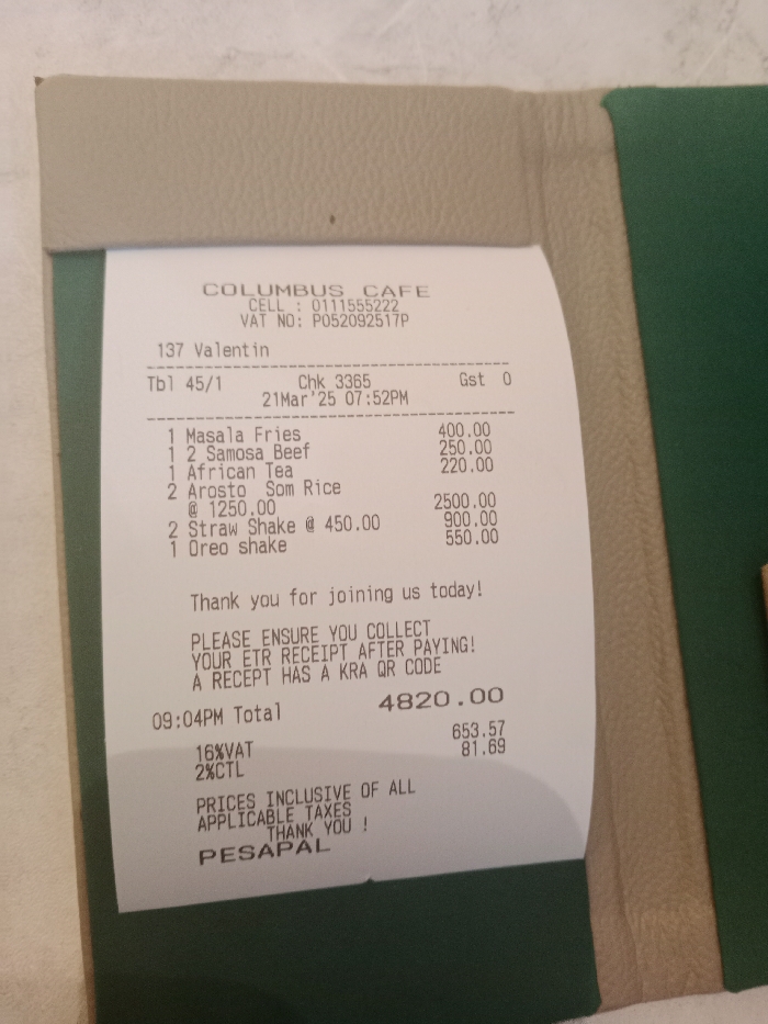 receipt from Columbus Cafe in Eldoret, Kenya, located at latitude 0.52 and longitude 35.268. The receipt is dated 21 March 2025 at 07:52PM and shows a total of 4820.00 Kenyan shillings for an order of 1 Masala Fries, 2 Samosa Beef, 1 African Tea, 2 Arosto Som Rice, 2 Straw Shakes at 450.00 shillings each, and 1 Oreo Shake. The receipt also includes VAT and 2% CTL. The customer name is Valentin and the table number is 45/1. The customer is being reminded to collect their receipt after paying. The receipt also states that all prices include all applicable taxes. The payment method is Pesapal.