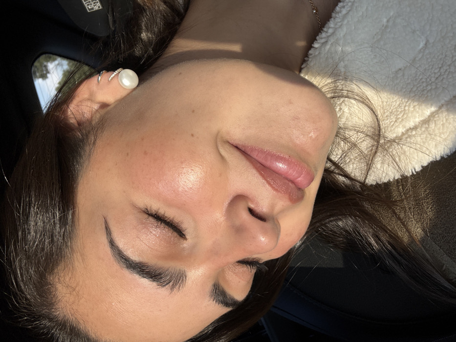 A woman reclines, her face turned towards the camera. Her eyes are closed, and a slight smile graces her lips. Her skin is fair with a rosy tint on her cheeks. Dark eyebrows frame her closed eyes. A pearl earring adorns her ear, with silver hoops above it. Her dark hair flows around her head, resting against a cream-colored, textured fabric. Sunlight illuminates her face, casting shadows and highlighting her features.
