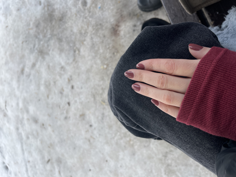 A close-up, first-person perspective image depicts a person's left hand resting on their left leg. The hand features light skin and fingernails painted with a solid, muted reddish-brown polish. The individual is wearing dark gray pants, likely denim, and a dark red ribbed long-sleeved garment. A dark shoe or boot is partially visible on the lower right, adjacent to a dark wooden surface, possibly a bench. The background is an out-of-focus expanse of patchy, dirty snow or ice with scattered debris, indicating an outdoor, cold-weather setting. While no specific landmarks are visible, the snowy ground is consistent with winter conditions in Moscow, Russia.