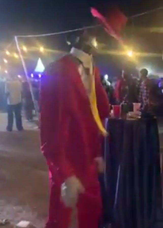 person in a red suit and a red top hat that appears to be floating over their head. The person is wearing white gloves and a white dress shirt with a gold-patterned tie. They are walking near a table covered with a dark blue cloth at an outdoor event. Other people are standing in the background, and there are string lights hanging above. The ground appears to be dirt.