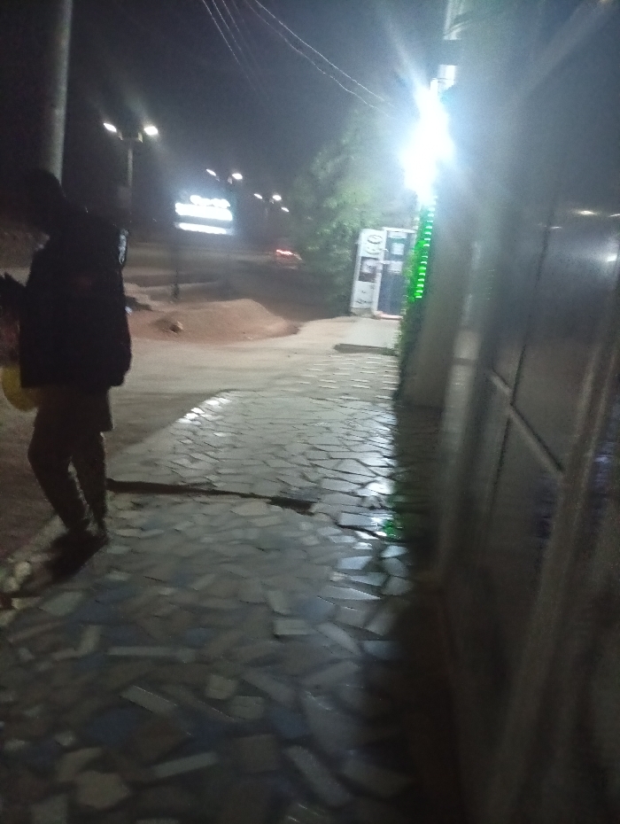 At night, a person stands on a tile sidewalk. The sidewalk is wet and reflects light. Behind the person is a road with streetlights and a sign in the distance. To the right of the person is a building with bright lights and a green decoration. The image is grainy and the lighting is poor.