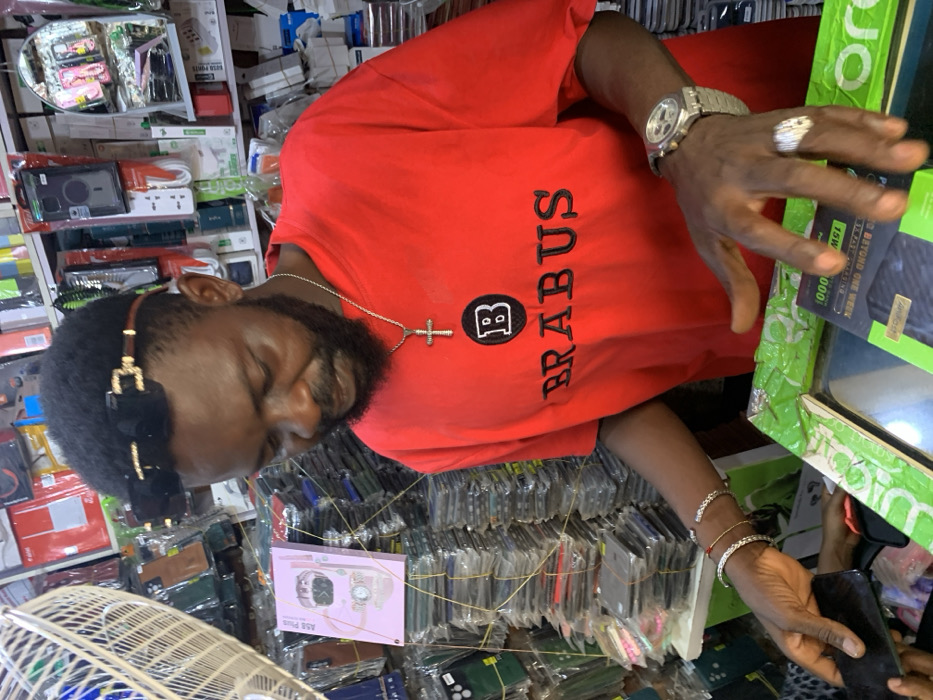 The scene depicts an indoor retail shop, likely an electronics or mobile phone accessory store, located in Lokoja, Nigeria