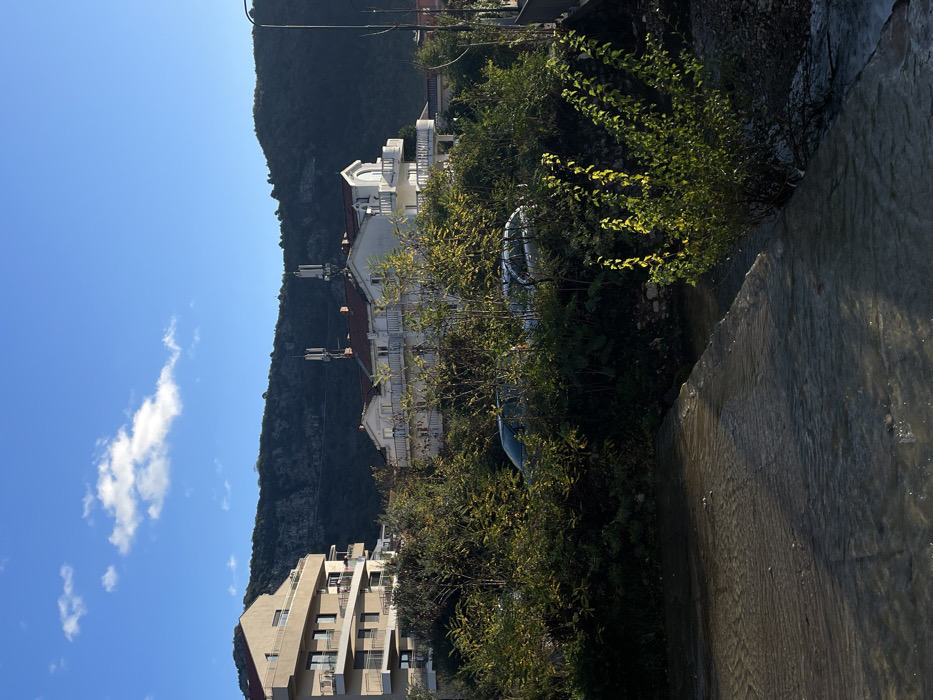 landscape with buildings nestled amidst lush green foliage against a backdrop of a mountain under a blue sky with scattered clouds. A grey surface with visible water running down occupies the foreground. A white building with a red roof stands out amidst the greenery, with communication towers visible atop. Lower down, a modern apartment building is also seen. A hint of a car is observed in the middle-ground, partially obscured by trees.
