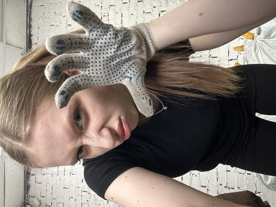 A young adult female individual is depicted in an indoor setting, likely a utilitarian space, characterized by a white-painted brick wall in the background and a partial view of a suspended ceiling with visible wiring. She is wearing a black short-sleeved top, black fitted pants, and a thin silver necklace with a small pendant. Her left hand, extended towards the camera, is covered by a light-colored work glove with blue PVC grip dots, its fingers splayed. She presents an exaggerated facial expression with a scrunched nose and puckered lips, looking directly at the viewer. In the lower right background, indistinct objects covered by white material with yellow, protrusion-like elements are partially visible. No specific location within the city of Chaikovsky, Russia is discernible from the visual information provided.