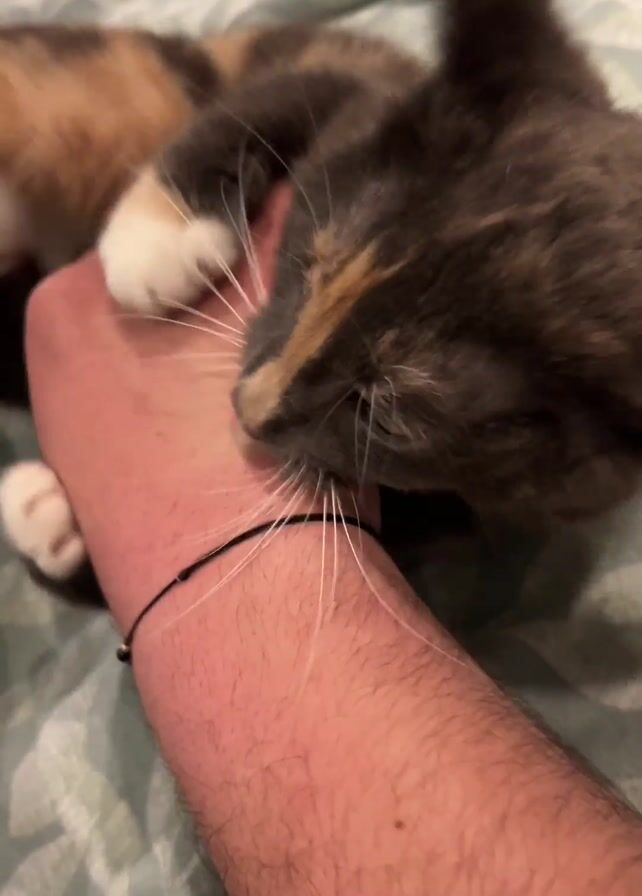 - "A short video shows a person holding their hand out on a patterned bedspread while a calico cat playfully bites it" by FM-2hcL22, licensed under CC BY 4.0