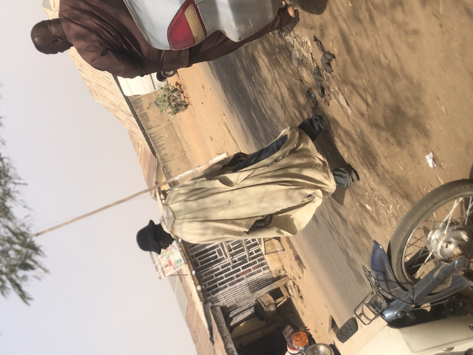 An outdoor, sunlit scene in Kufena, Nigeria, depicts a dusty roadside environment with two adult males, buildings, and vehicles