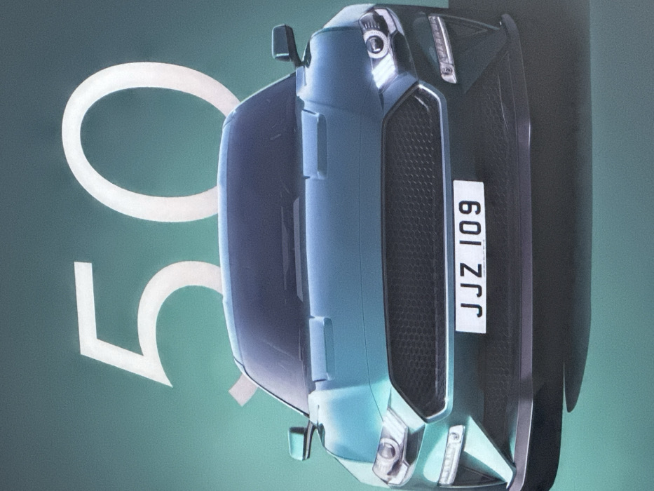A dark teal or emerald green Ford Mustang, specifically an S550 generation (2018-2023 facelift model), is positioned centrally, facing directly forward. The vehicle's headlights are illuminated. Its front grille is a dark, honeycomb pattern without a visible emblem. A white rectangular license plate with the black characters "JJZ 109" is affixed to the lower front bumper. The background is a uniform teal-green, with large, stylized white numerals "50" partially visible behind the car's roofline, "5" on the left and "0" on the right. The scene depicts a graphic or advertisement rather than a physical location. No people, objects other than the car, or actions are depicted. The scene is situated in Tashkent, Uzbekistan.